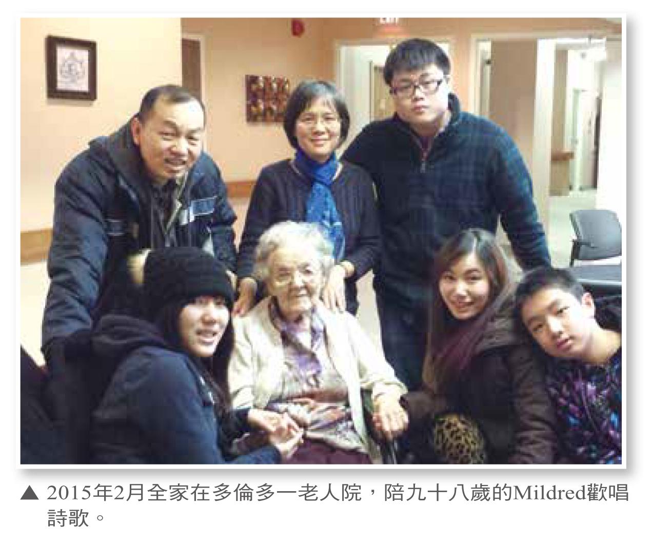 2014年回到多倫多,在救世軍教會聚會,我們夫妻一起配搭敬拜團,兩個兒子仍然參與打鼓的事奉;當教會每月定期去老人院領聚會缺同工時,我們及時的參與,頗受歡迎;每週五晚上的青少年聚會,小兒子與我們再次動員出擊,服事社區跨種族文化的孩子們。
