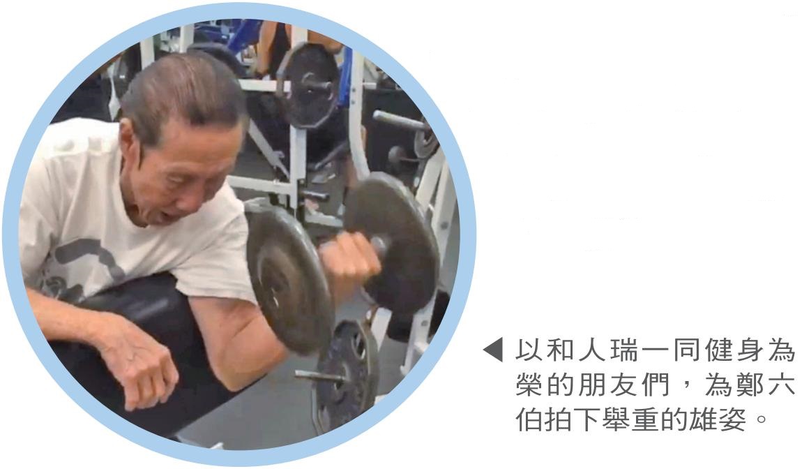 鄭六伯在健身房有許多朋友,規律地上健身房使他有出門社交的機會。但請別誤會,鄭六伯在健身房,並非大多時候在跟人聊天,他每日有自訂的健身例行目標。他說,舉重之間不能休息太久,必須保持肌肉在熱身狀態,否則肌肉冷卻不利成長。他每日有不同的重點訓練肌肉群:第一日是手臂和肩膀,第二日是胸部和上半身腹肌,第三日是腿部和肩膀,三日一輪。