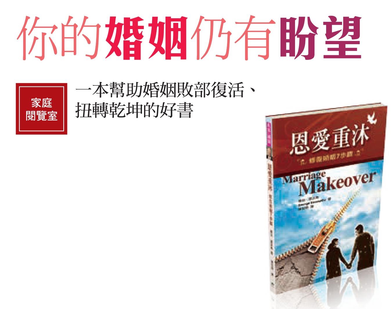 喬治‧康沃希(George Kenworthy)所著的《恩愛重沐―修復婚姻7步驟》(Marriage Makeover)一書,內容著重如何重建及強化的主題,不但深入淺出,每章末了還附有實用的「必做的一件事」習題。作者康沃希博士獲有協談博士學位,兼具牧會、領導和輔導的豐富經驗,交互運用本書內容,成功改善和挽救無數婚姻。認真閱讀及實踐者,必能從中獲取婚姻「小修到大修」的要訣。正如作者強調,只要實行本書內容,婚姻就要發生神蹟―經歷人的盡頭就是神的起頭。