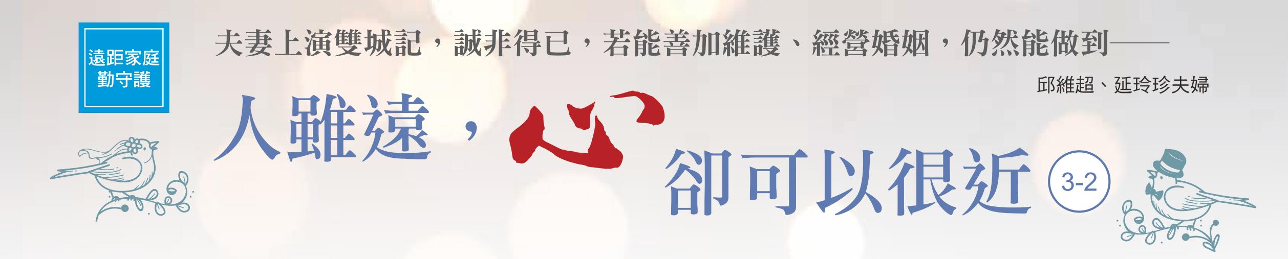 前文提要:上期分享了「是否適合過遠距夫妻生活」自我檢測表及增進遠距夫妻信任與親密感的「十個愛的約定」。此次與大家探討遠距夫妻及親子關係的維護與經營。