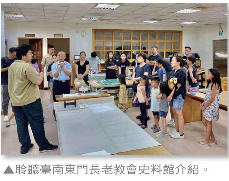 Emily出生時就有嚴重的先天性心臟病,富理在她出生後17天後就到美國讀神學。當時仁美一個人帶她住在這裡,下班後從圖書館走回家的路上,一面唱著詩歌,一面為Emily禱告。子孫們實地看到阿嬤當年每天必須單獨走這麼遠,體會她的不容易。在這個校園裡,劉牧師夫婦曾帶領許多大學生信主,所牧養的學生分散在世界各地,繼續愛主服事主,其中不少成為牧者。 因為時間限制,又因學校已經搬離舊址,所以沒機會參觀仁美父親所參與開辦的中台神學院。仁美只能述說許多童年美好回憶,讓家人心嚮往之。 7月10日 來到臺南,他們參訪富理父親劉華義牧師曾牧養的新化長老教會,也是富理的出生地。教會席開五桌熱情歡迎,許多富理還認得的會友,年紀都大了。同工帶他們參觀教會文獻史料,其中有富理母親彈過的風琴,與富理父母有關的紀錄及相片,以及華義牧師親筆寫下的文獻。富理幼年時病弱,媽媽常帶著他到禮拜堂跪下禱告,培育他敬虔的生命。 西港聖教會,是仁美父親王錦源牧師於1928年設立的臺灣第一家聖教會。他本來在日本讀法律,在一次夏令會中,聽見上帝清楚的呼召,改念神學。他的父母反對,不供應學費。後來妻子在臺灣病危,他從日本回來探望,禁食禱告一個禮拜,妻子奇蹟式地得醫治,從此父母支持他的宣教服事。 禮拜堂外的一個石碑上,記載著開創教會的年日,仁美這才知道當時父親年方19。現任的牧者,還有不曾見過面的親人都來相聚,講述過去的種種,說禮拜堂旁邊的大片土地,本來都是錦源牧師的,後來被日本人徵收,只剩下這一塊蓋禮拜堂的地方。將近百年的教堂,2024年想要拆除重建,願上帝賜福。 再回到臺南,參觀了看西街長老教會。富理夫婦到美國的早期,劉華義牧師就在此牧養教會。牆上掛著歷任傳道人的相片,孫輩們也跑去與阿祖的相片合影。富理夫婦還記得這裡許多弟兄姊妹深愛著華義牧師夫婦,常常聽到他們美好的見證。 7月11日 參觀臺南東門長老教會,他們的史料館儲存了相當大量的教會史料,又有專人修補歷史文獻 ,負責的同工以英語向劉家兒孫們解說並帶他們參觀。臺灣教會對教會歷史文獻如此珍惜保留,讓他們感動。這是富理作神學生時實習的教會,帶領造就許多年輕人,也是富理的母親當長老服事的教會。他們也到臺南神學院,是劉華義牧師曾教學、富理曾就讀的神學院。50年前富理仁美在東海大學舉行婚禮之後,又假臺南神學院禮堂補行一次感恩禮拜,好讓眾多臺南親友參加。