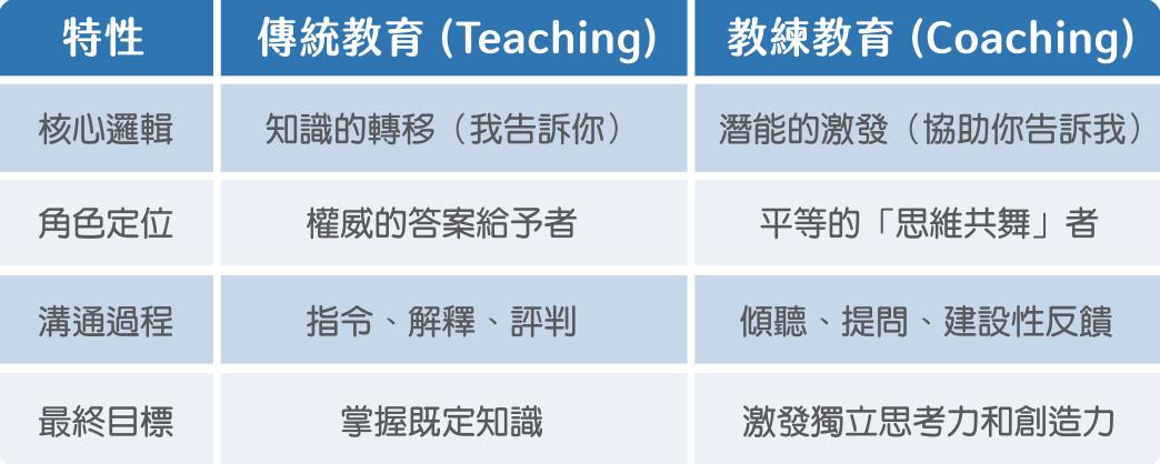 教練式教育與傳統教育(Teaching)有著本質的區別: