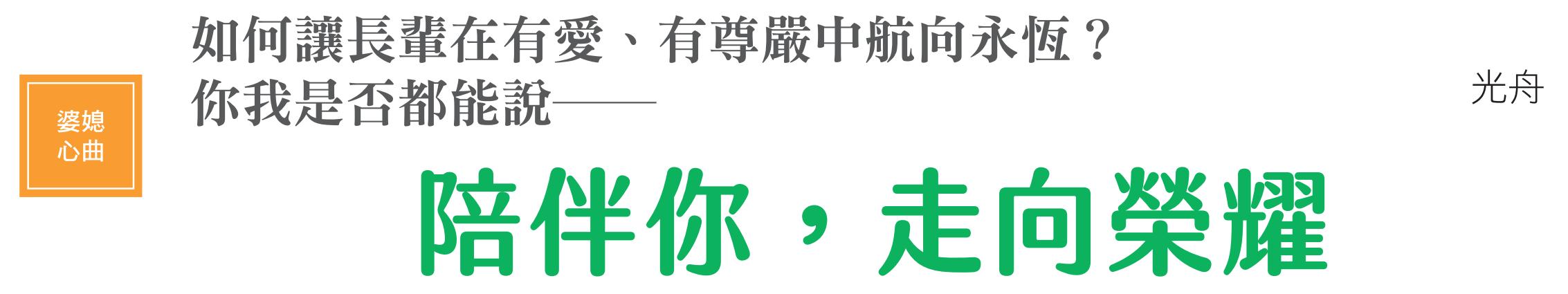 接下重責大任 靜靜地,我看著婆婆的生命力在眼前一點、一點地流失。 是一種溫柔卻不可逆的退場,像一艘小船,在被夕陽染紅的水面上悄然離岸,慢慢地駛向彼岸。遠方的岸邊已有主人揮手迎接,但小船上的人,仍對此岸依依不捨。心中仍有許多牽掛及未竟的心願,有些話還沒說完,有些感情還沒表達,手沒握緊,夢沒圓滿。因此,小船以極慢的速度向前滑行,滑過的每一寸水波都是掙扎。